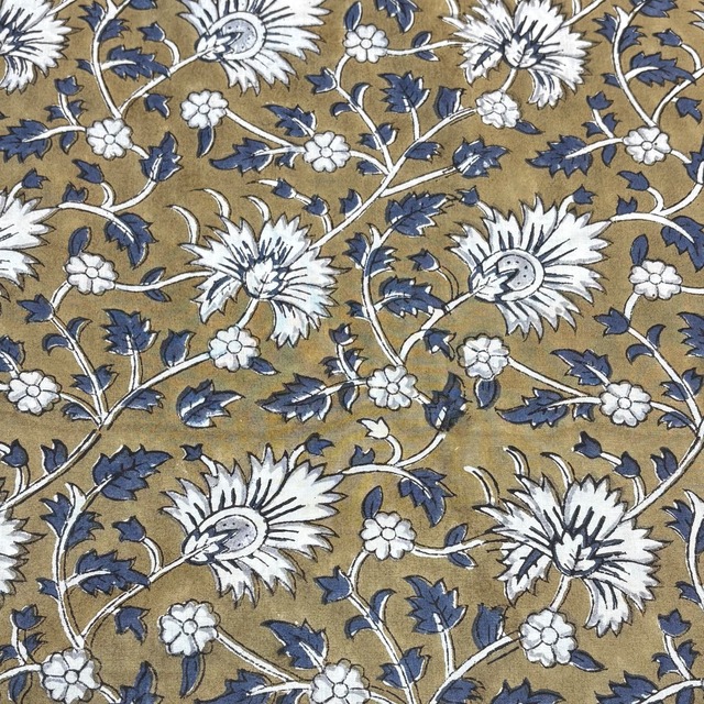 カーキに並ぶ葉模様のブロックプリント布 インド手仕事のコットン生地|幅110cm・50cm単位販売