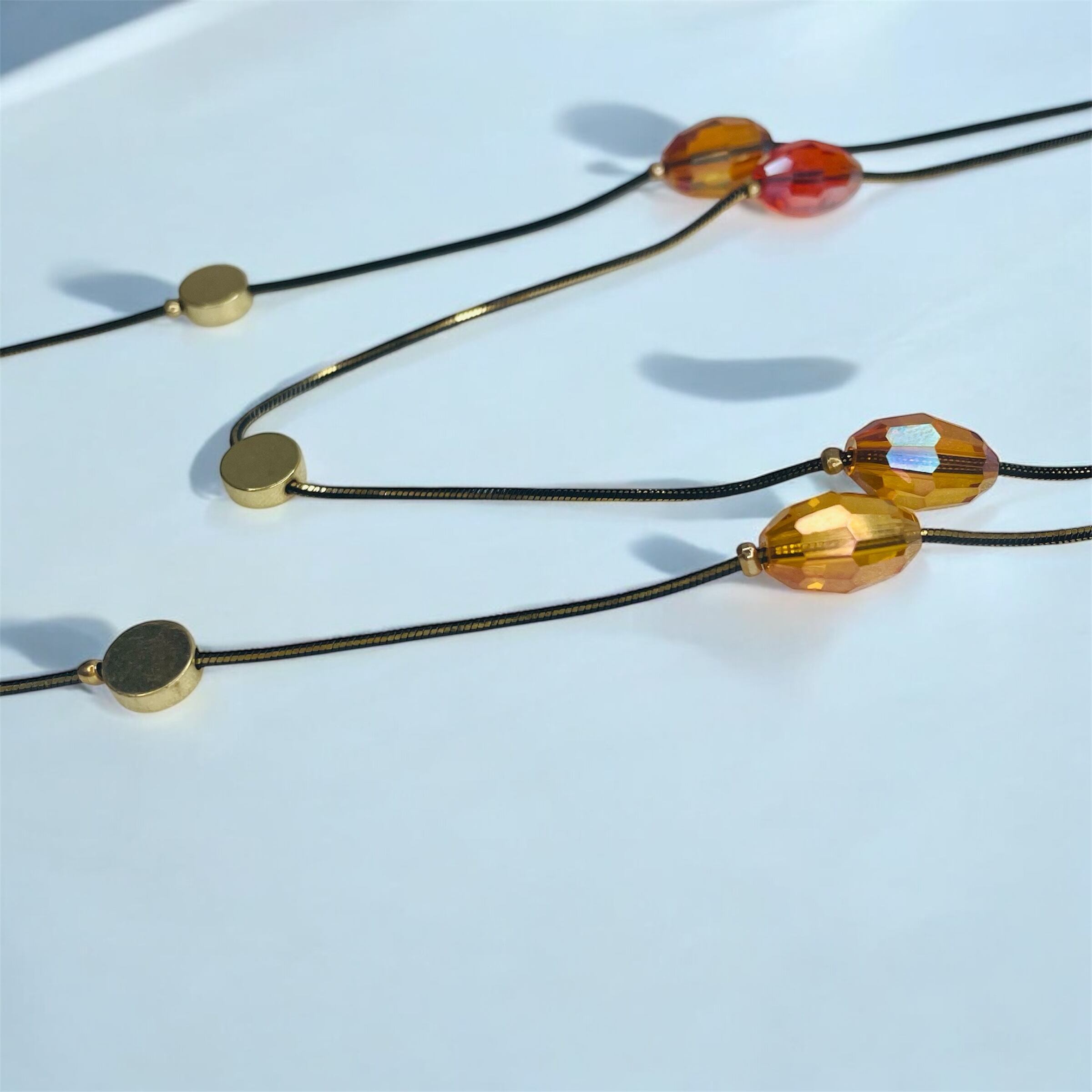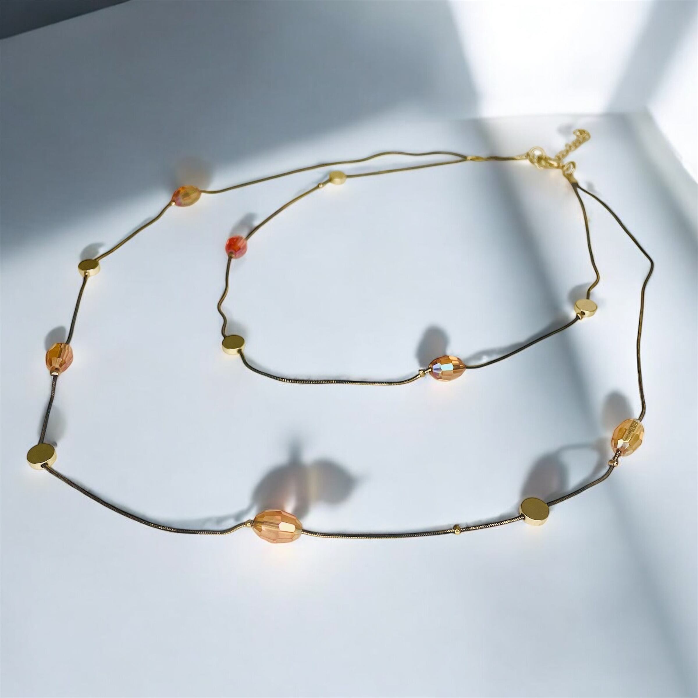 オーロラ加工のオレンジビーズと、平らなゴールドメタルパーツを組み合わせた、