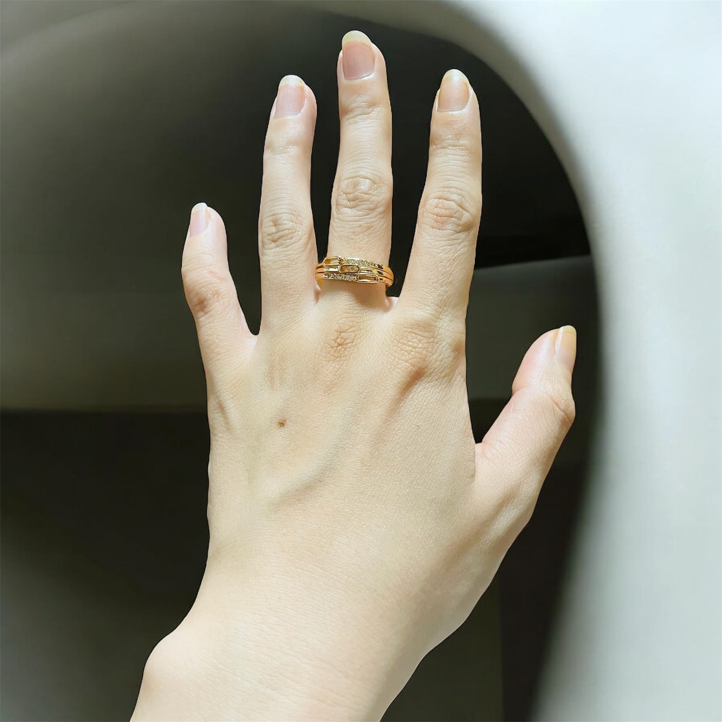 ゴールドのあたたかみと華奢な構造が、指を細く長く見せてくれるので、
