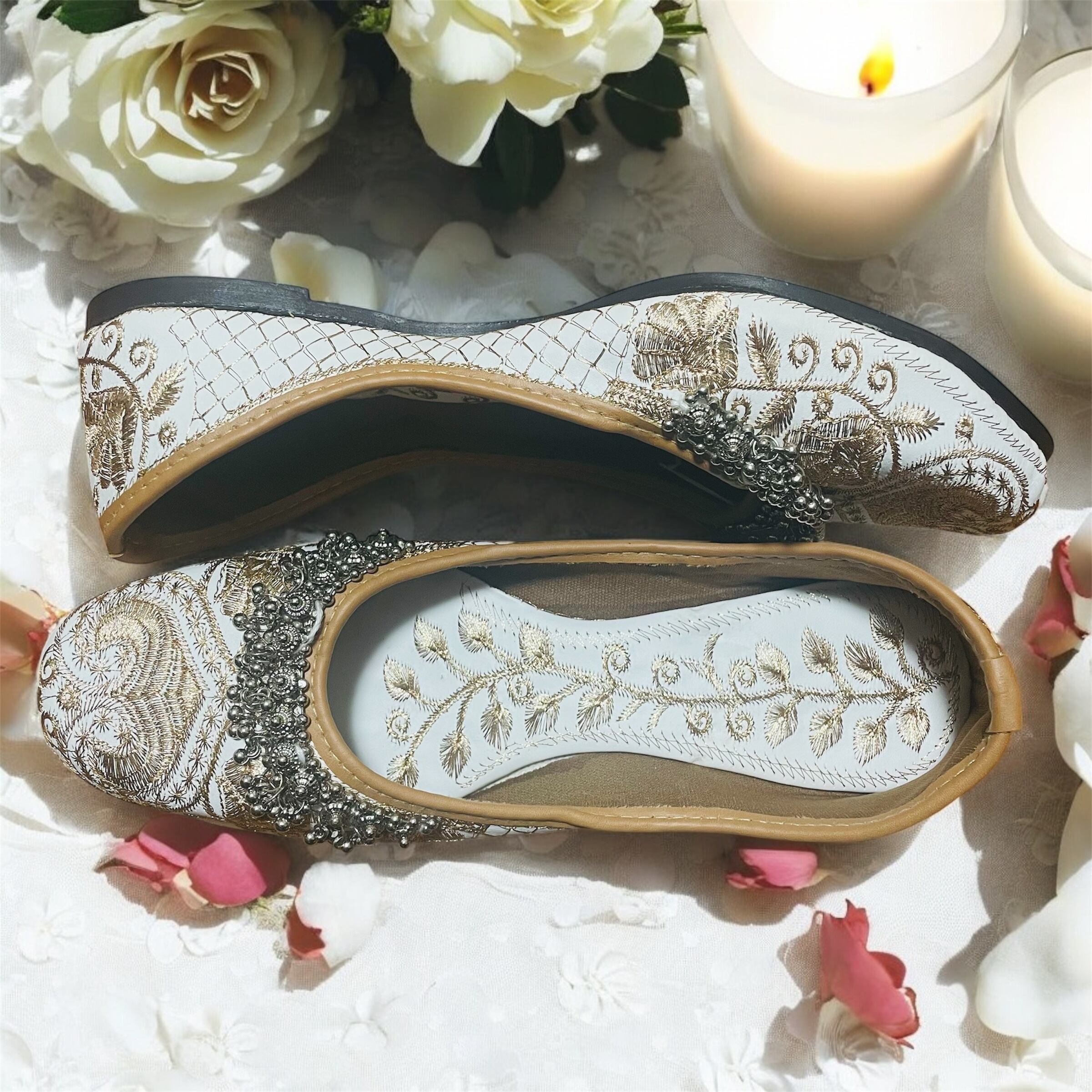 黒や深色が多いジュッティの中で、ここまで明るく透明感のある一足は貴重な存在です。