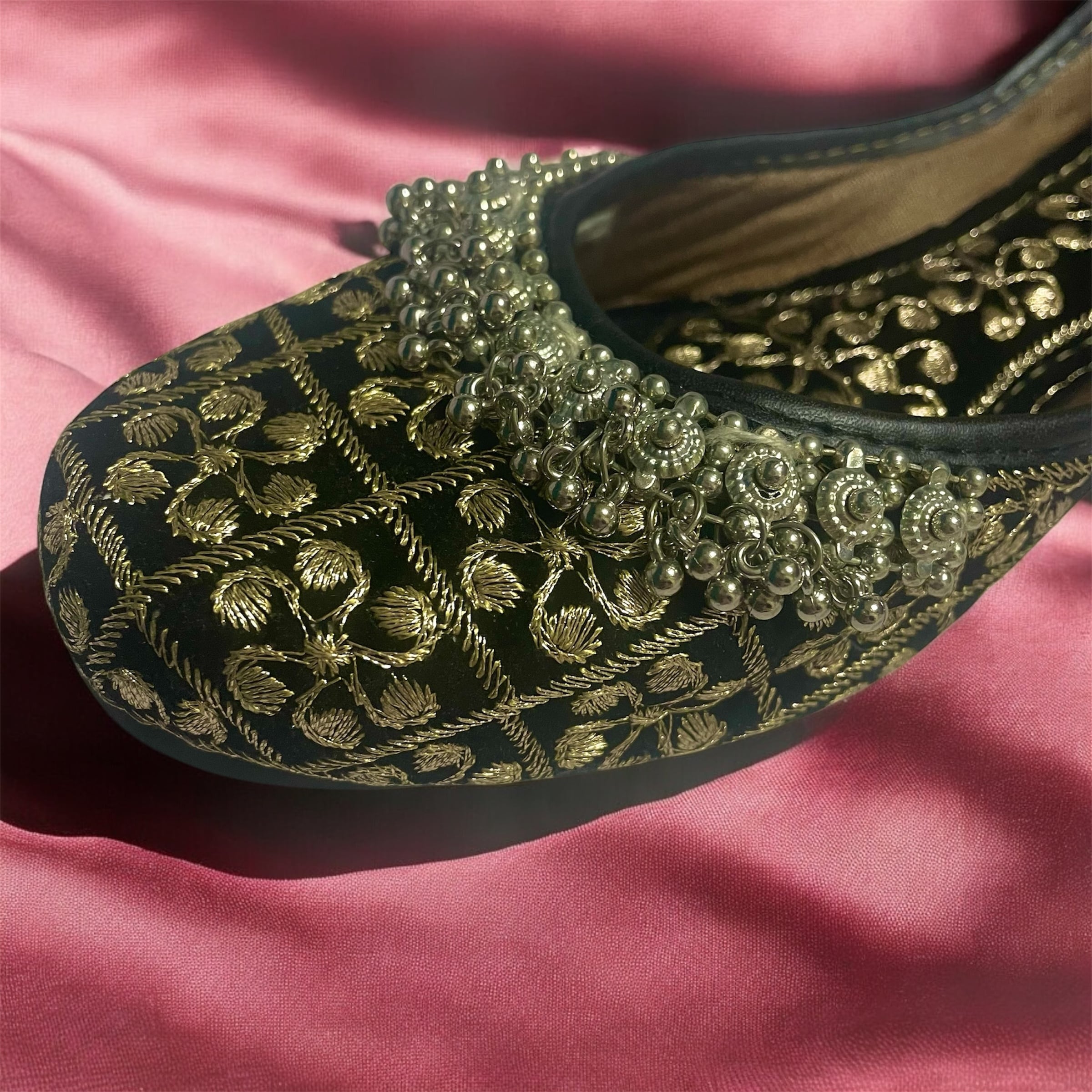 黒の布地に、金糸で編まれた蔦模様と格子の刺繍が浮かびあがるジュッティ。