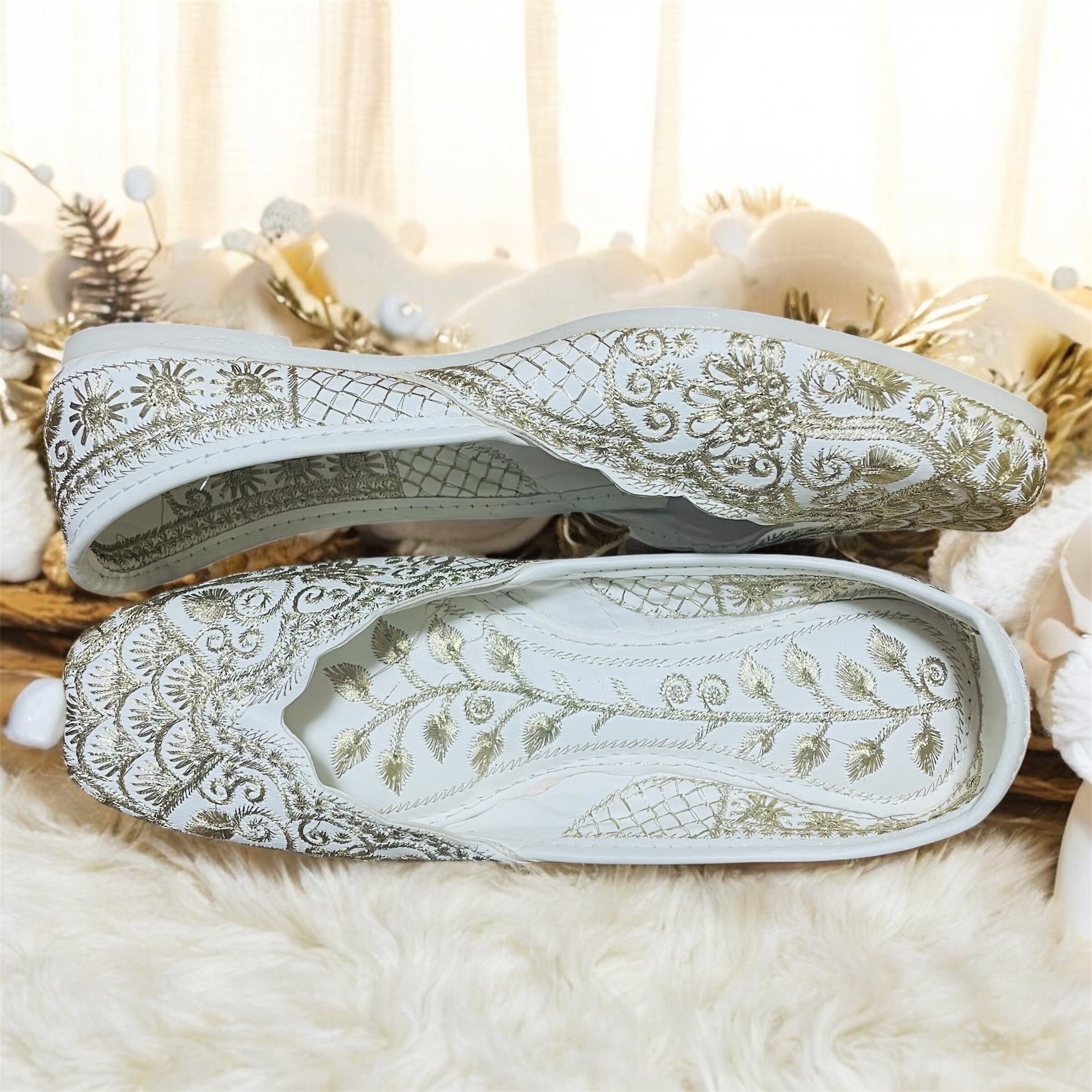 やわらかな白地に金糸の刺繍が波紋のように広がるジュッティ。