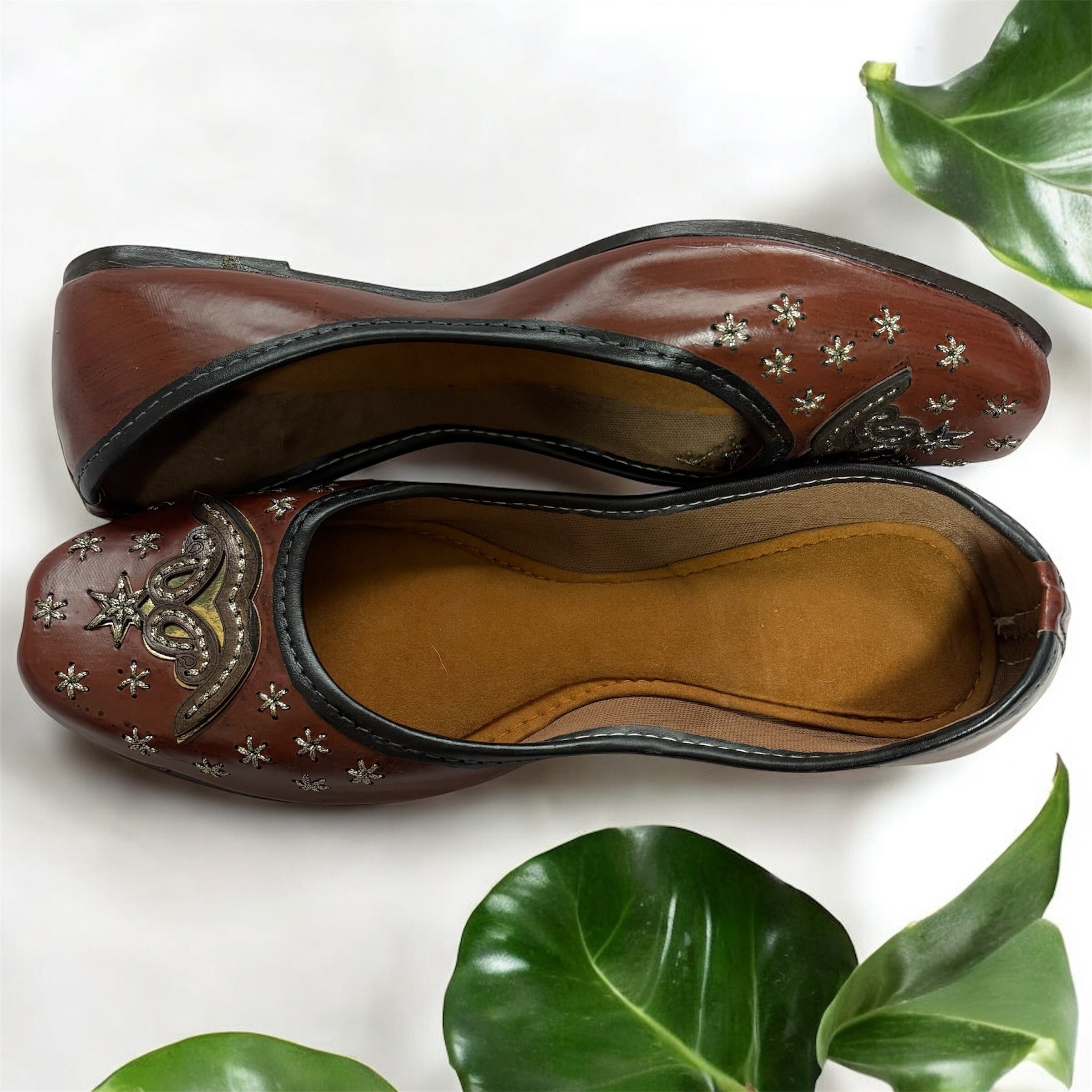 落ち着きのある赤茶に、銀の輝きが映える一足です。