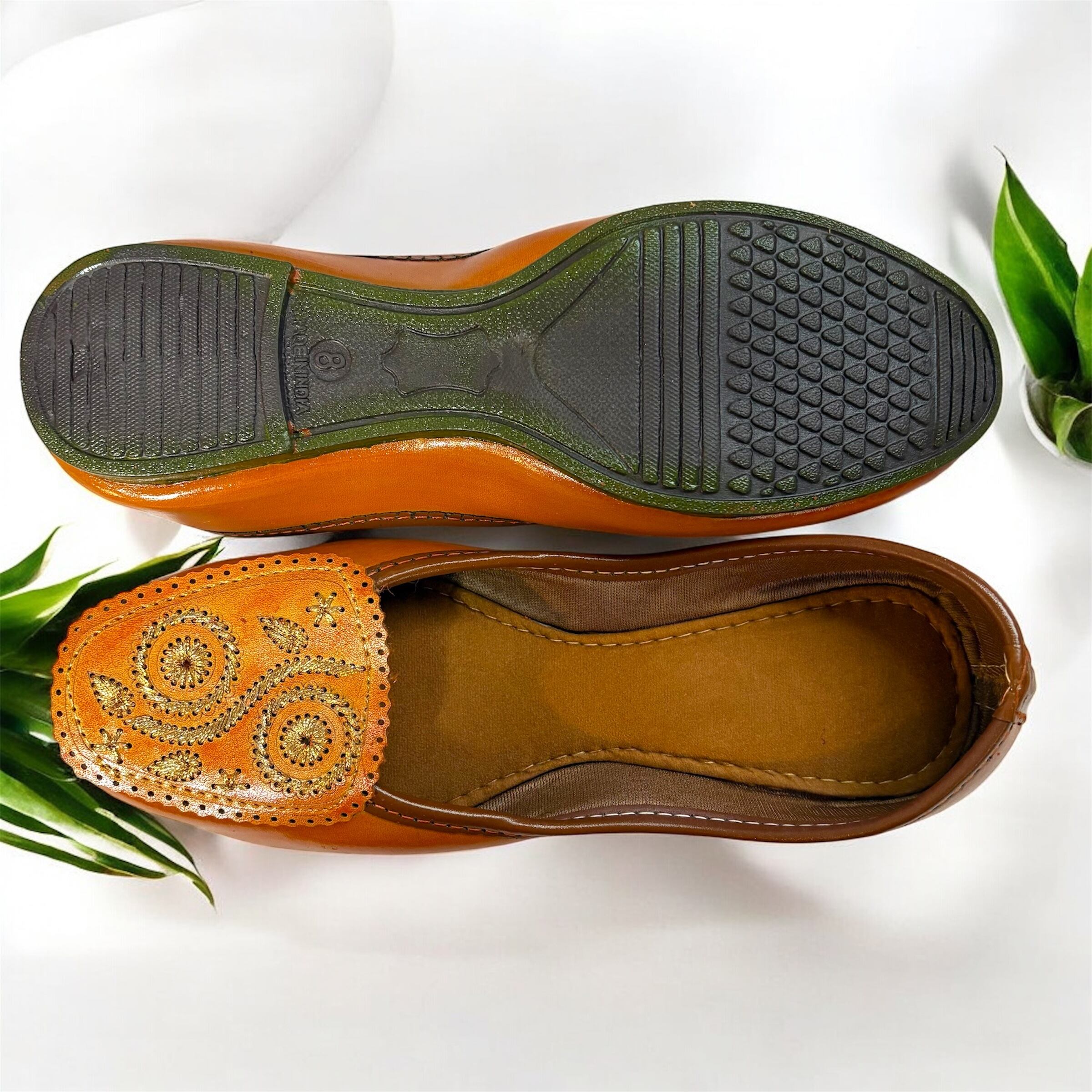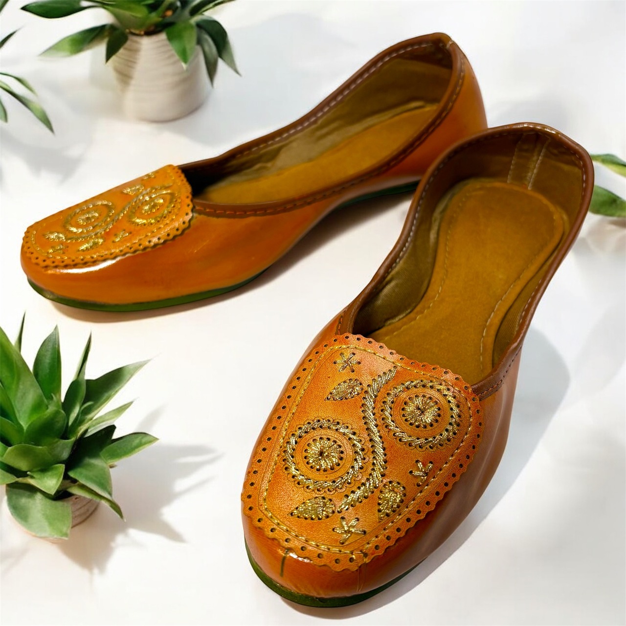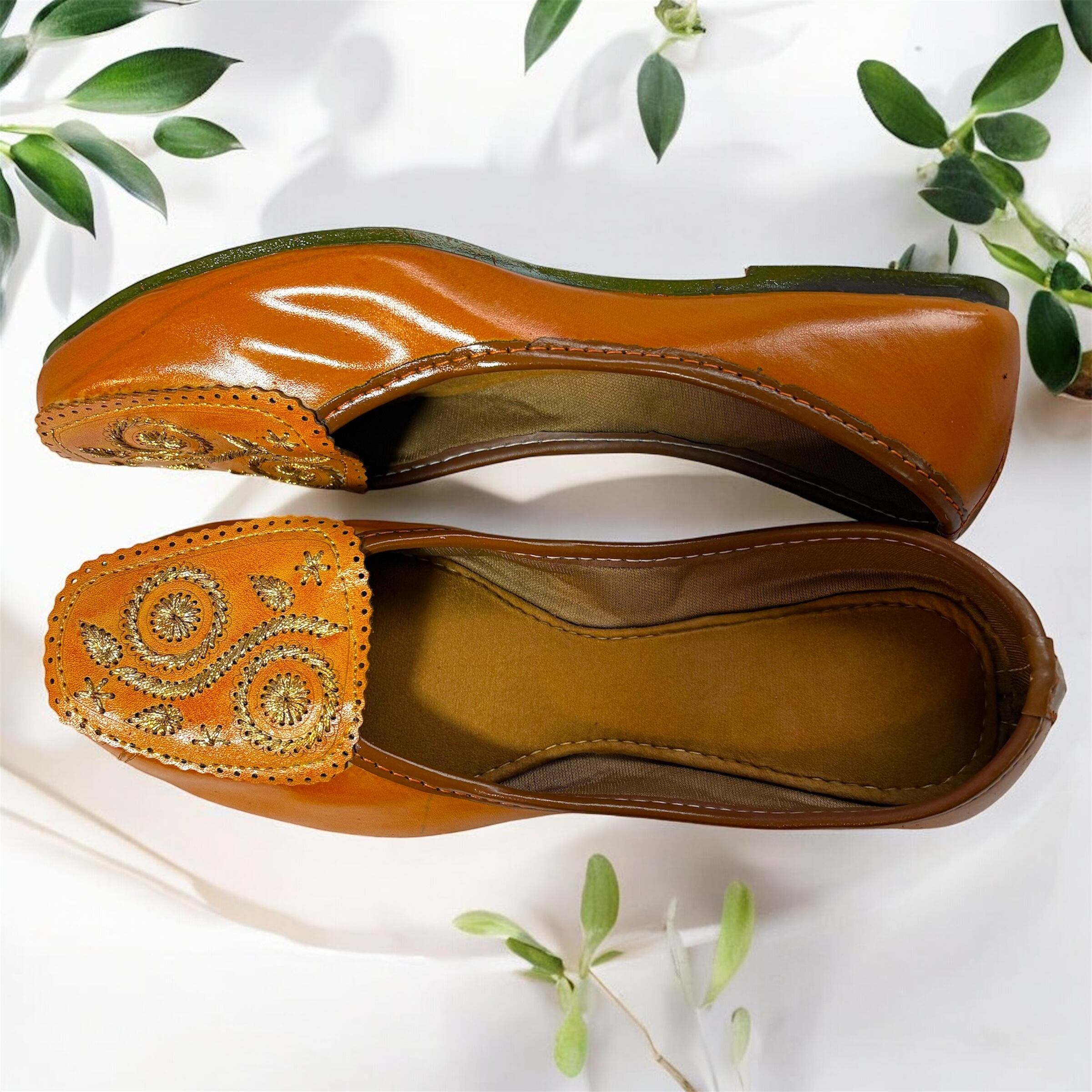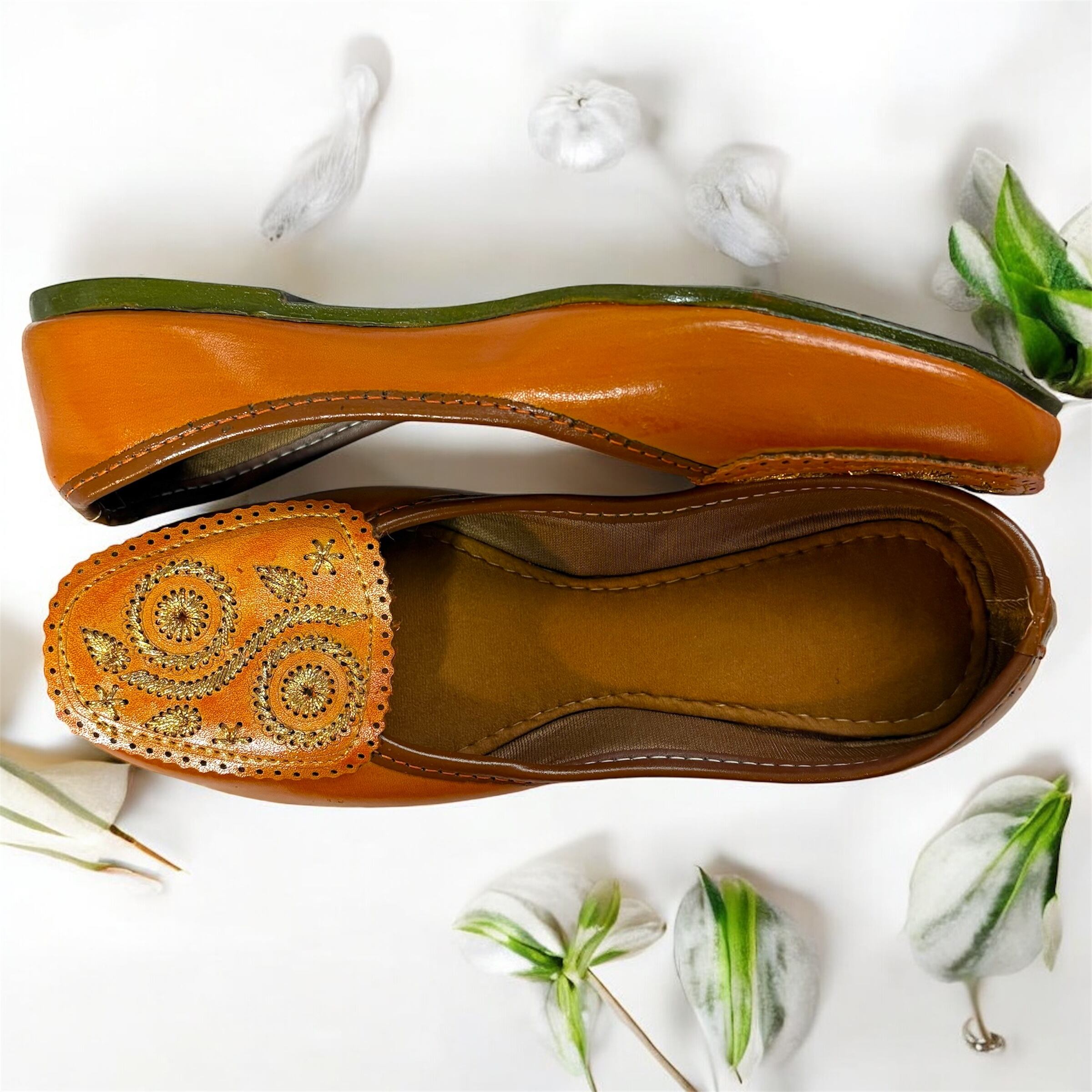 キャメル色の合皮に、金糸でつる草が芽吹くように広がるジュッティ。