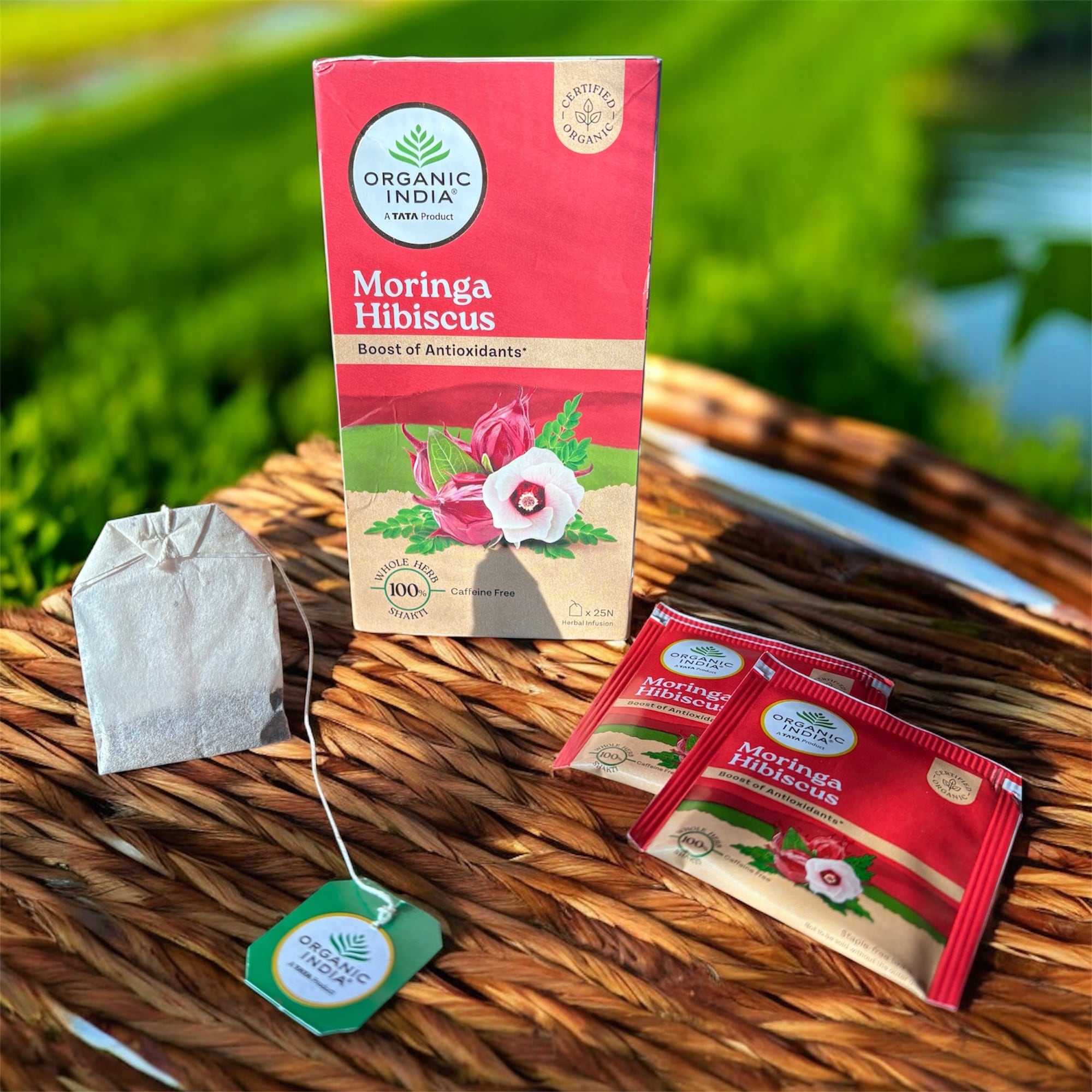ORGANIC INDIA モリンガ&ハイビスカスは、インドの伝統的な植物文化に着想を得てブレンドされた、オーガニックハーブティーです。