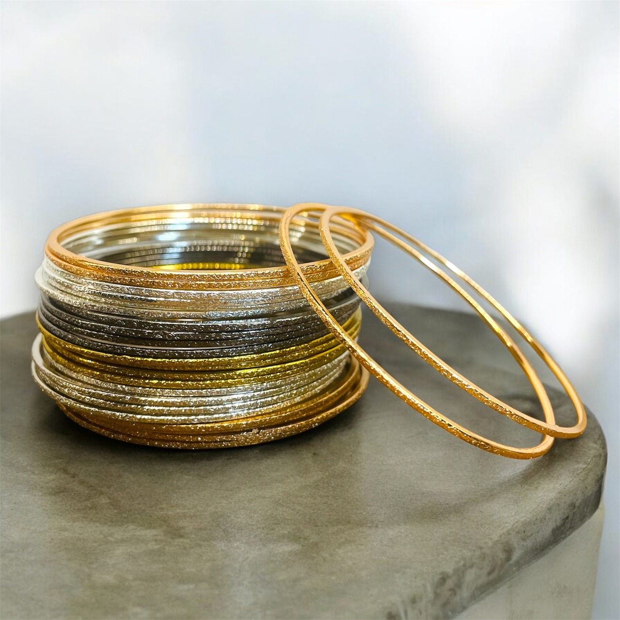ラメ入りで輝くメタリックカラーが目を引く、極細バングルの4本セット。インドの伝統的なデザインを取り入れたオリエンタルなデザインが魅力的です。全6色の中からお気に入りの組み合わせを見つけて、コーディネートに華やかなアクセントをプラスしてみてください。