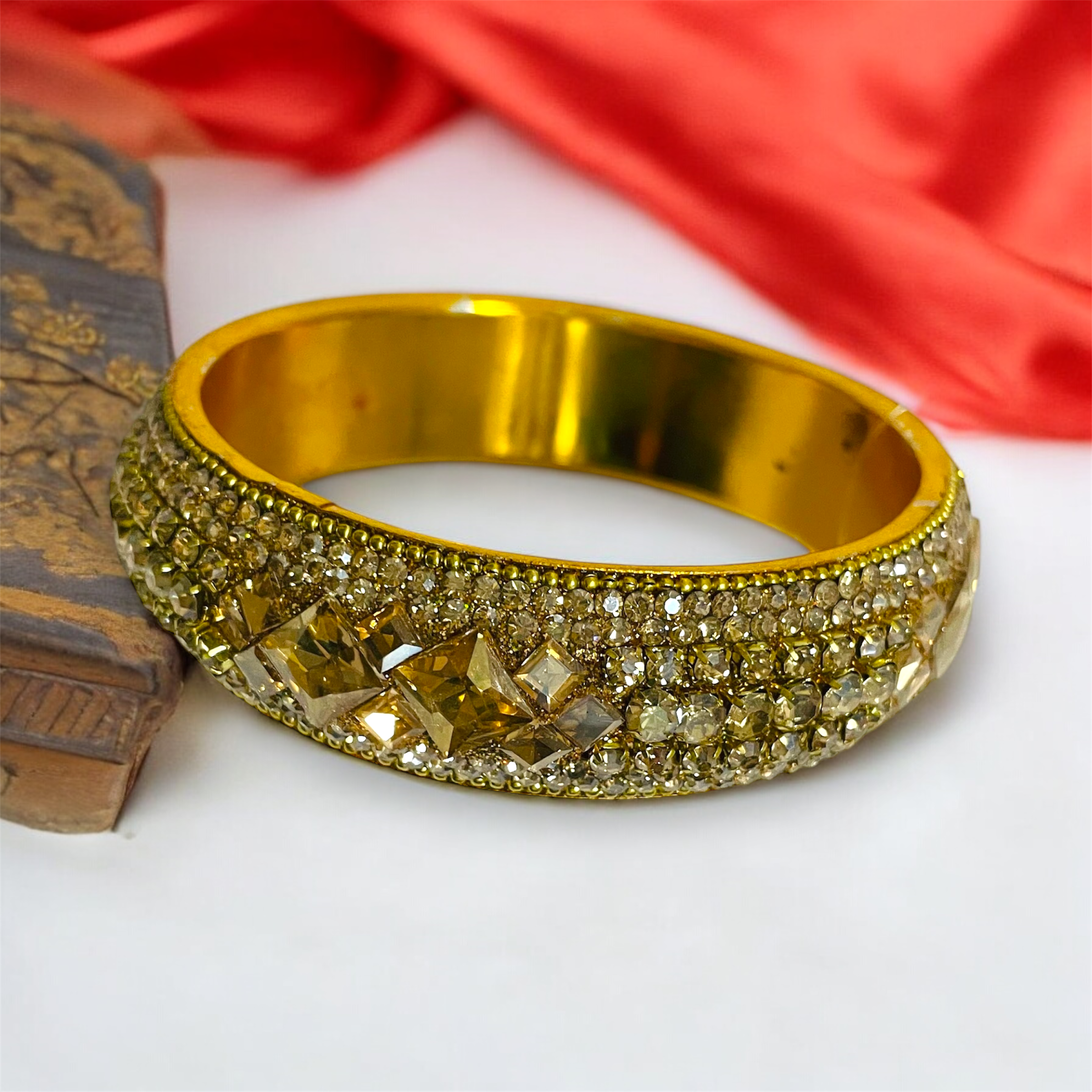豪華なラインストーンとゴールドの輝きでさらに華やかな一品。ボリウッドスタイルのエレガントさを演出するアイテムです。インドから仕入れたインポートアイテムです。バングルはインドの女性たちにとって、特別な日や祝祭日に身につけられる大切な装飾品。その輝きと美しさは、一目見て心を奪われること間違いありません。このバングルを身に着けることで、まるでボリウッドの女優のような気分に浸れるかもしれません。特別な日やパーティーで、周囲の視線を釘付けにすること間違いなしです。是非、特別な日に華を添える一品としてお楽しみください。