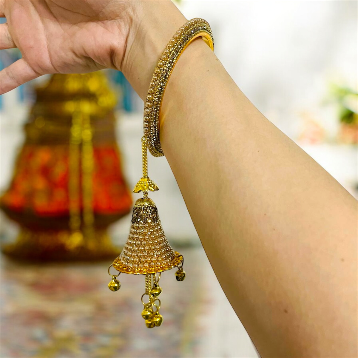 美しいインドの文化を身に纏いたい方へ贈る、ジュムカバングルが登場しました。金色の輝きが特徴のこのバングルは、エスニックなファッションにぴったりマッチします。手首を飾るだけで、一気に華やかな印象を与えてくれること間違いなしです。腕を動かすたびシャラシャラと鳴るジュムキは周囲の視線を集めること間違いなし。インドの職人が丹精込めて作り上げた逸品を、是非あなたの手元で輝かせてください。心躍るようなご購入に、どうぞ胸躍る思いで。