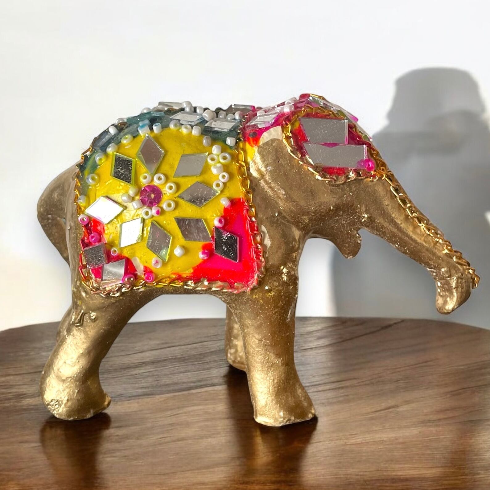煌びやかなミラーワークが施された象の置物。エキゾチックなデザインが融合したこのアイテムは、インテリアのアクセントとして素晴らしい存在感を発揮します。豊かな色彩と独特の模様が、どんな空間でも目を引くポイントになることでしょう。幸運や繁栄を象徴する象は、あなたの生活空間に心温まるメッセージをもたらします。